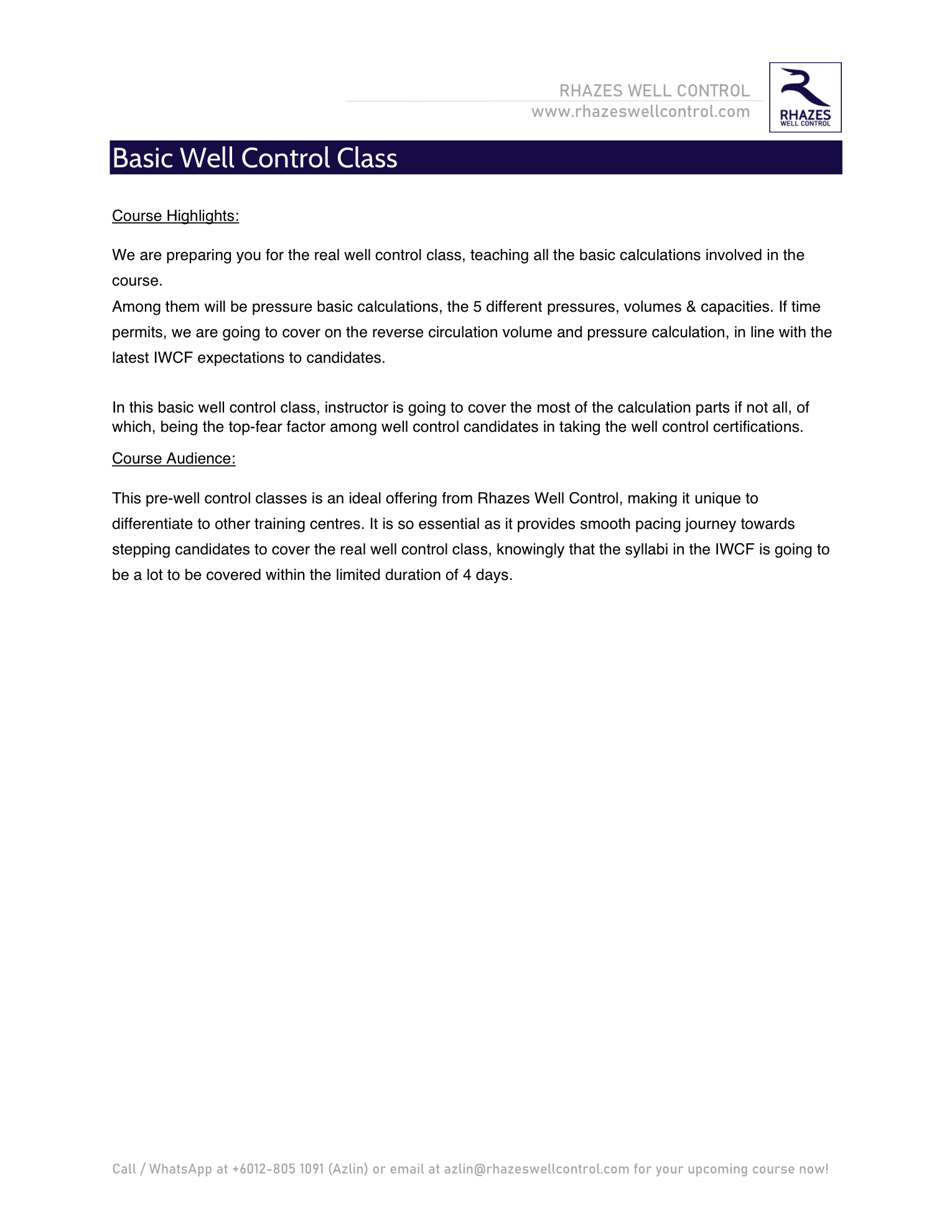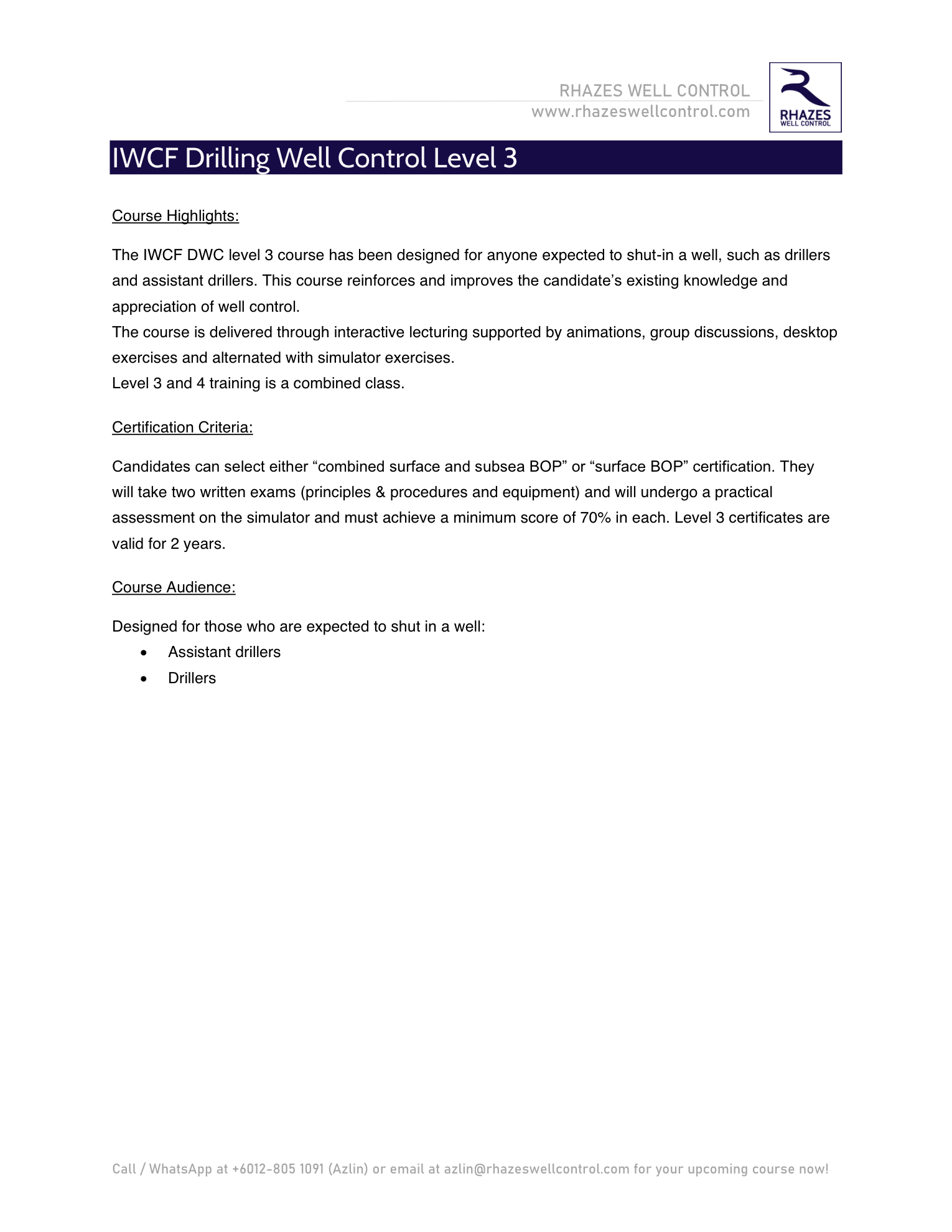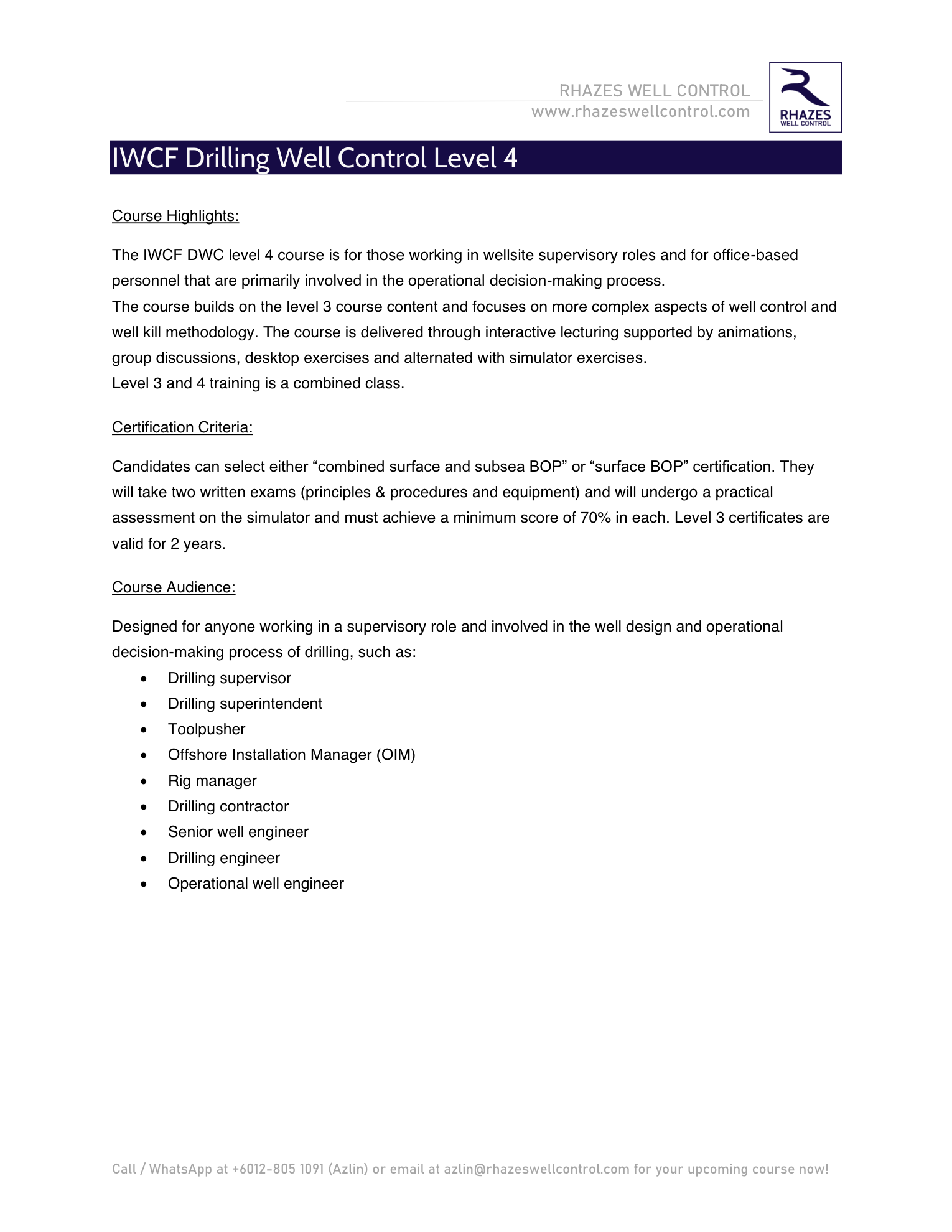 Rhazes Well Control offers both IWCF Drilling Well Control and IWCF Well Intervention Pressure Control courses, which at the end of the course, if you pass, you will be awarded with IWCF Certificate from the UK. • Utilizing coiled tubing perforation, E-line perforation, well testing & unloading.